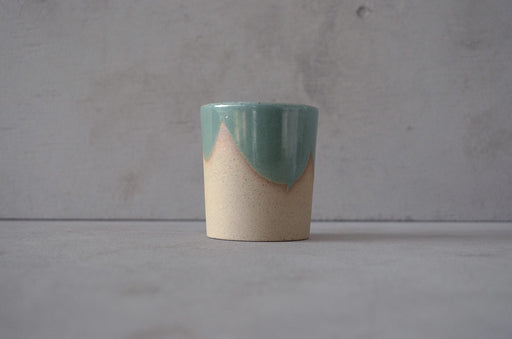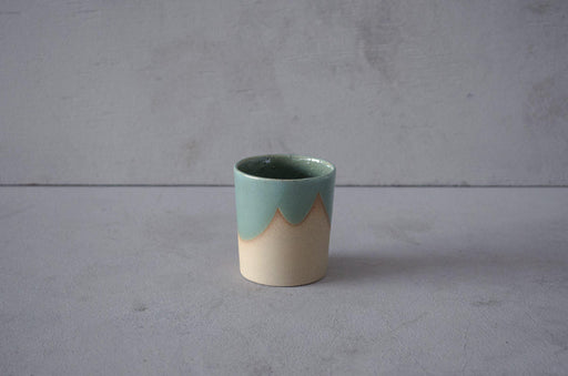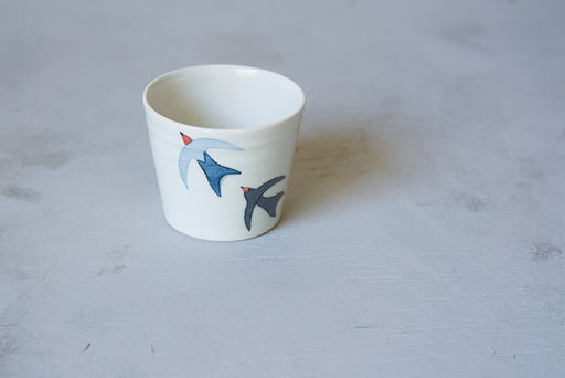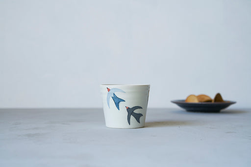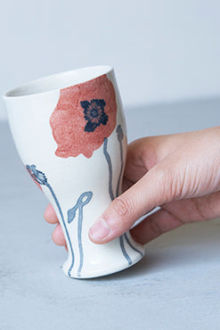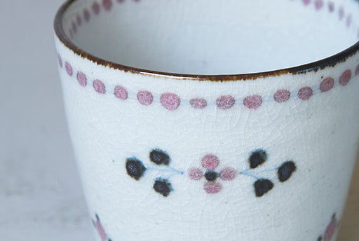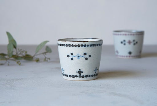砥部焼(とべやき)のコップです。 コブレットのように高さがあり、お酒などを楽しむのにもちょうどよいサイズです。 砥部焼で行われている「和紙染」を応用した絵付けによって描かれています。和紙染は、素焼きした素地の上に、モチーフの形に切り取った和紙を張りそのうえから絵の具を塗ります。そして和紙を剥が...