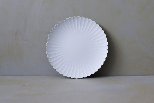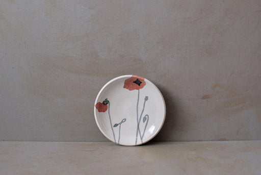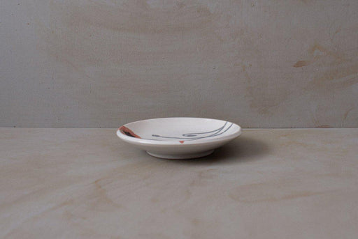 長戸製陶所の5寸皿です。 芥子の絵柄は、砥部焼で行われている「和紙染」を応用した絵付けによって描かれています。 和紙染は、素焼きした素地の上に、モチーフの形に切り取った和紙を張りそのうえから絵の具を塗ります。そして和紙を剥がし、釉薬をかけて焼成を行う技法です。筆で描くのとは異なり、和紙の繊維の...