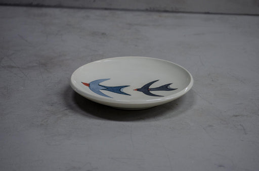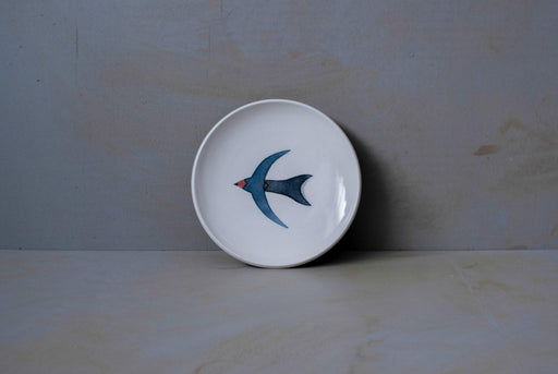 長戸製陶所のツバメシリーズから、使いやすいサイズの五寸皿です。 こちらはツバメの柄が一匹あしらわれた柄。それぞれ濃い青のもの、淡い青のもの、また2匹ずつのものと3タイプあります。 取り皿にする以外にも、おつまみをよそったり、ケーキや和菓子のためのお皿として活躍します。使い勝手が良いので、プレ...